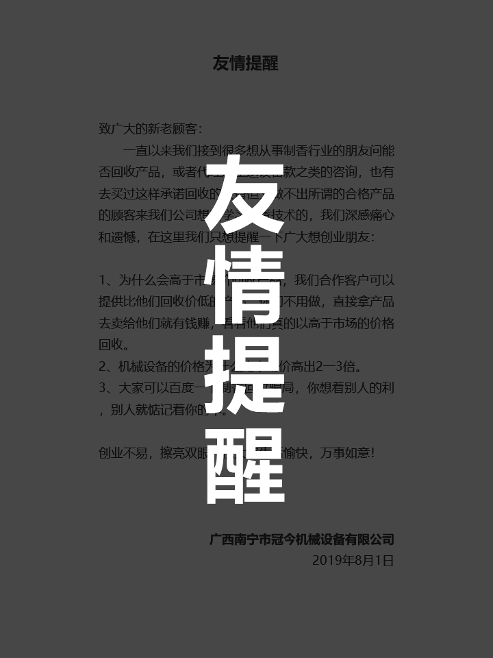 廣西南寧市冠今機械設備有限公司(原南寧市富利機械加工廠)是一家集制香機械設備開發設計、香品生產銷售于一體的科技企業,引進國際先進技術所研究出來的制香機設備是可生產多種類型的衛生香,檀香,竹簽香等。擁有大型香業基地及堅實的硬件基礎,在制香機械領域具有從研發到批量生產的全方位優勢。